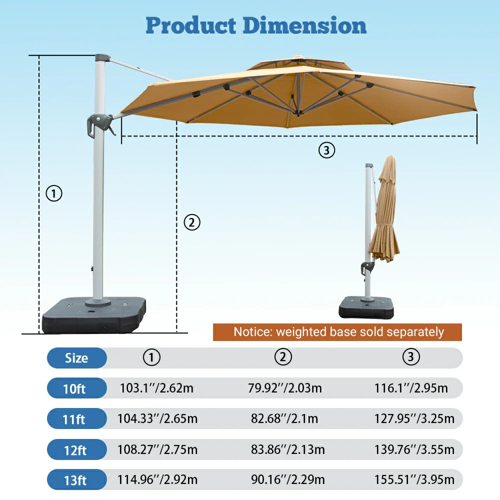 Double-top designed with both style and functionality in mind, our cantilever patio umbrella seamlessly integrates into any outdoor setting. Its sleek design adds a touch of elegance to your patio or deck while providing essential sun protection.